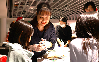 香りを選んで調合するアロマスプレーやまつぼっくりツリーのワークショップ、管理栄養士が作るクリスマスピザ、ポップコーンやつぼやきいもの販売などを通じて、約150名の方がご来場されました。